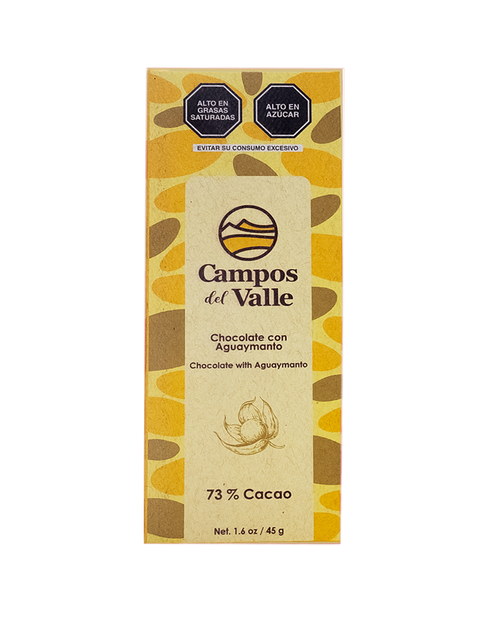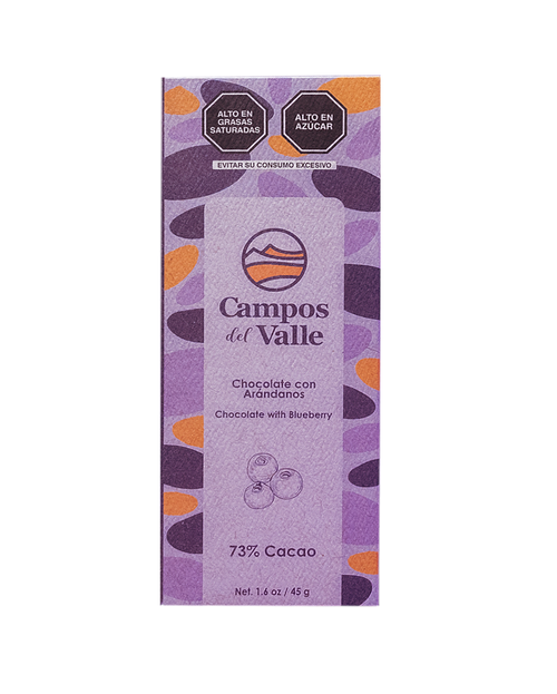 Características: el chocolate con sabor a arándano “CAMPOS DEL VALLE” 73% cacao, es un producto elaborado con los granos de cacao colección VRAE 99 - GANZO, producidos en la Finca Torres, ubicado en la localidad de Otari San Martín, del distrito de Pichari. Están hechos con la mejor selección de granos de cacao, producidos y cultivados en la localidad de San Martín de Otari del distrito de Pichari Cusco - Perú; “TREE TO BAR”; haciendo uso de control biológico como agente de control de plagas y enfermedades; Cada uno de nuestros productos ofrece perfiles de sabores y aromas únicos que te transportarán a los “orígenes del cacao Peruano”; es muy recomendable para todas las edades e ideal para veganos.